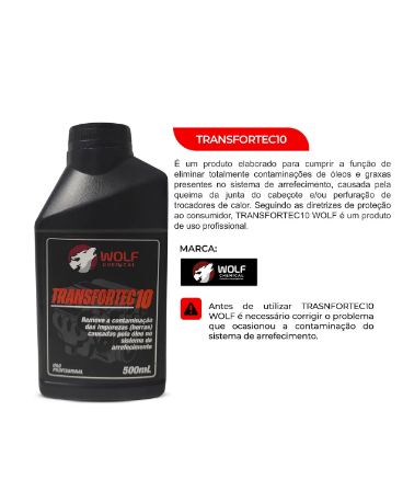 TRANSFORTEC10 WOLF – LIMPEZA PROFUNDA DO SISTEMA DE ARREFECIMENTO O Transfortec10 Wolf é um limpador profissional desenvolvido especialmente para eliminar contaminações por óleo e graxa no sistema de arrefecimento. É indicado em casos de falhas como queima da junta do cabeçote ou perfuração de trocadores de calor, que resultam na mistura indevida de lubrificantes com o fluido do radiador. Sua fórmula com alto poder de emulsificação e detergência remove totalmente os resíduos contaminantes, restaurando a eficiência térmica do sistema. Produto de uso profissional, desenvolvido conforme as diretrizes de segurança e proteção ao consumidor. MODO DE USO: Com o motor frio, retire a tampa do reservatório e adicione o conteúdo do frasco de Transfortec10 Wolf. Complete com água limpa até o nível indicado e tampe o sistema. Ligue o motor com o ar quente ativado e aguarde que a ventoinha acione por duas vezes. Desligue o motor, drene o sistema e faça o enxágue com água limpa de 2 a 3 vezes. Após a limpeza, complete o sistema com aditivo para radiador diluído em água desmineralizada, conforme a proporção recomendada pelo fabricante do veículo. Rendimento: 1 frasco trata sistemas com até 6 litros de capacidade total. IMPORTANTE: Antes da aplicação, corrija a origem da contaminação, como falhas na junta do cabeçote ou trocadores danificados. COMPOSIÇÃO: Emulsificantes, dispersantes e agentes detergentes de alta performance. - O anúncio é referente a 1 unidade do Transfortec10 Wolf 500 mL. * Envio em até 24 horas: Garantimos agilidade no envio para que você receba seu pedido o quanto antes. * Nota fiscal: Todos os produtos acompanham nota fiscal para sua segurança e confiança. * Atendimento online: Estamos disponíveis para tirar suas dúvidas. Utilize o chat e fale diretamente conosco. * Sobre a loja: Aqui você encontra uma grande variedade de produtos com qualidade e preços acessíveis. Não perca tempo, compre com quem entrega de verdade! Garantia do vendedor: 30 dias